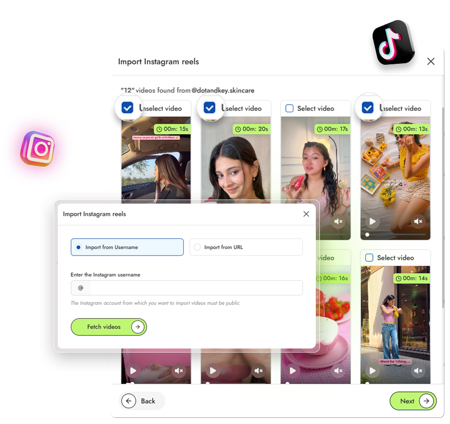 Import videos from Instagram, TikTok, and YouTube without linking your accounts. Transform social content into shoppable experiences that drive conversions. No technical skills required.
